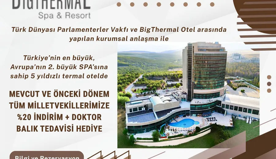 BigThermal Otel arasında yapılan kurumsal anlaşma ile Türkiye’nin en büyük, Avrupa’nın 2. büyük SPA’sına sahip 5 yıldızlı termal otelde mevcut ve önceki dönem milletvekillerine ve birinci derece yakınlarına %20 özel indirim uygulanacak ve her türlü cilt hastalığına faydası olan doktor balık tedavisi hediye edilecektir. Detalı bilgi ve rezervasyon için Ceren Hanımı arayabilirsiniz. 0 542 480 13 37