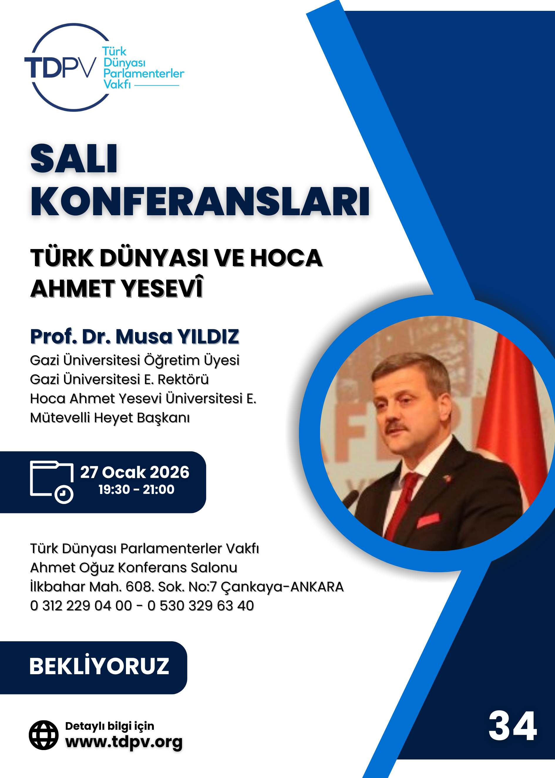 Vakfımızın düzenlediği 34. Salı Konferansına Gazi Üniversitesi Öğretim Üyesi Prof. Dr. Musa Yıldız konuk olarak katıldı ve "Türk Dünyası ve Hoca Ahmet Yesevi" konusunda katılımcılara bilgi verdi